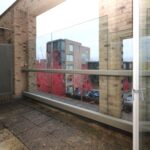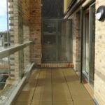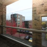 Large french windows opening onto full width glassed in balcony with views.