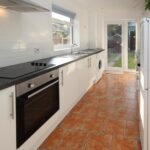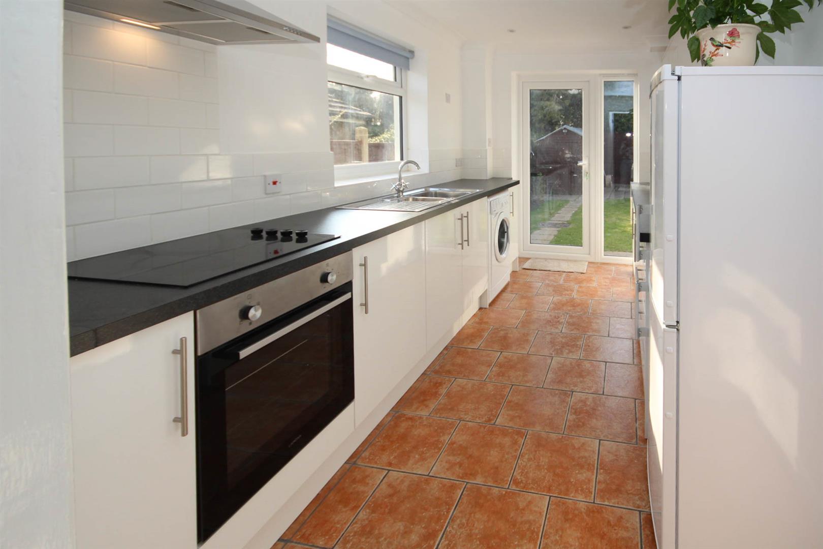 Galley style kitchen, refitted with white laminate units, built-in elelctric oven, ceramic hob with extractor fan above. Large fridge/freezer and washing machine provided. Door at rear to garden. Dishwasher can be provided.