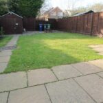 Side access to rear garden with 2 x paved patio areas and lawn . Good sized shed with power .