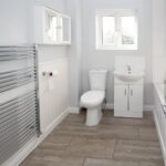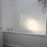 Family bathroom newly refited, tiled and panelled with white suite including vanity untit. Shower over bath .