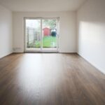 Spacious living room with LVT / laminate flooring and french windows opening onto patio and garden .